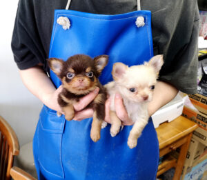 (性別)女の子(2匹とも) (誕生日)2025年8月 (毛色)チョコタン(左)・クリーム(右) (両親) (価格)ご相談にのります