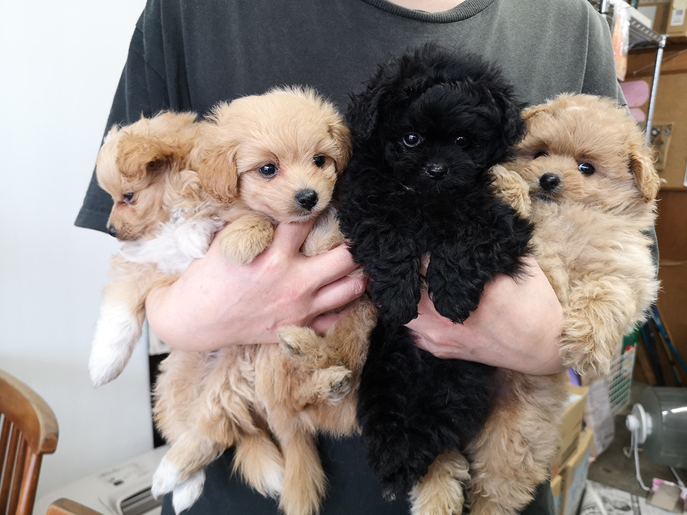 (性別)男の子(4匹とも)(誕生日)2025年9月(毛色)アプリコット・ブラック(両親)(価格)ご相談にのります